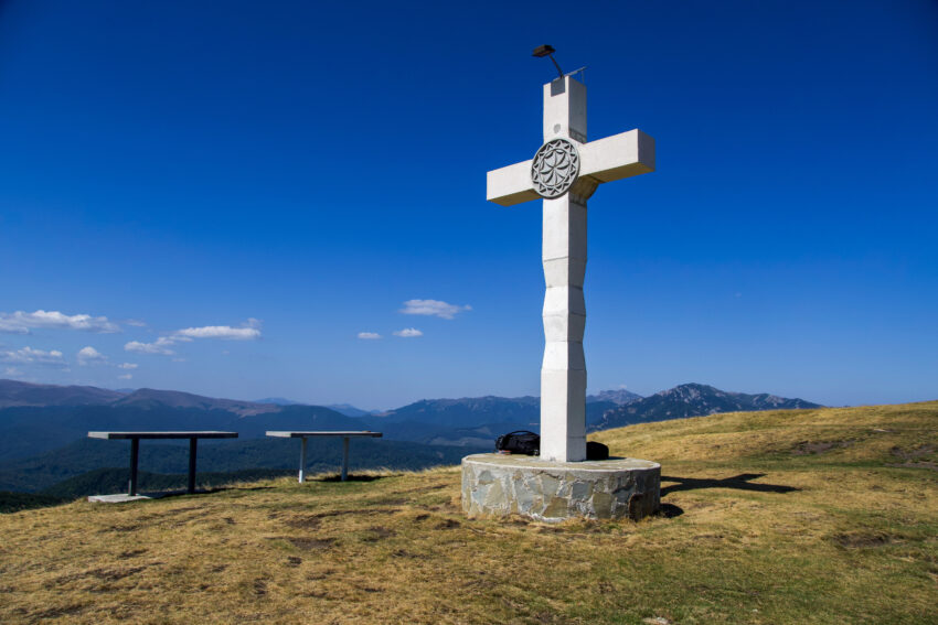 Noi pedalam in continuare fara pauze mari și ne apropiem vertiginos de varf. Dam de o stana cu multi caini, pe care suntem nevoiți s-o ocolim atat la dus, cat si la întors. In rest, nu intampinam nicio problema, totul merge ca uns. In nici 2 ore si 30 minute suntem pe varf, langa crucea imensa construita acum 4 ani.